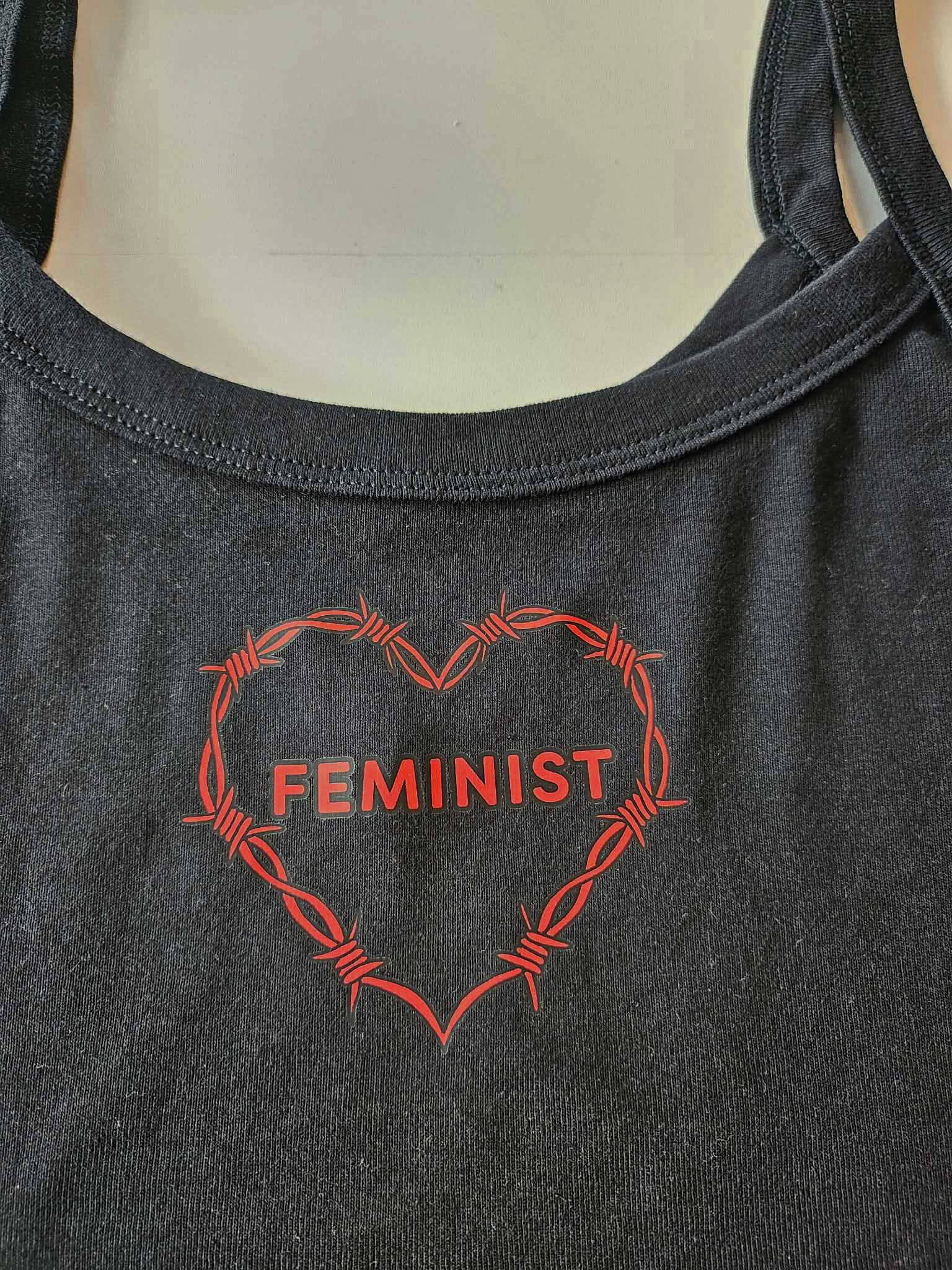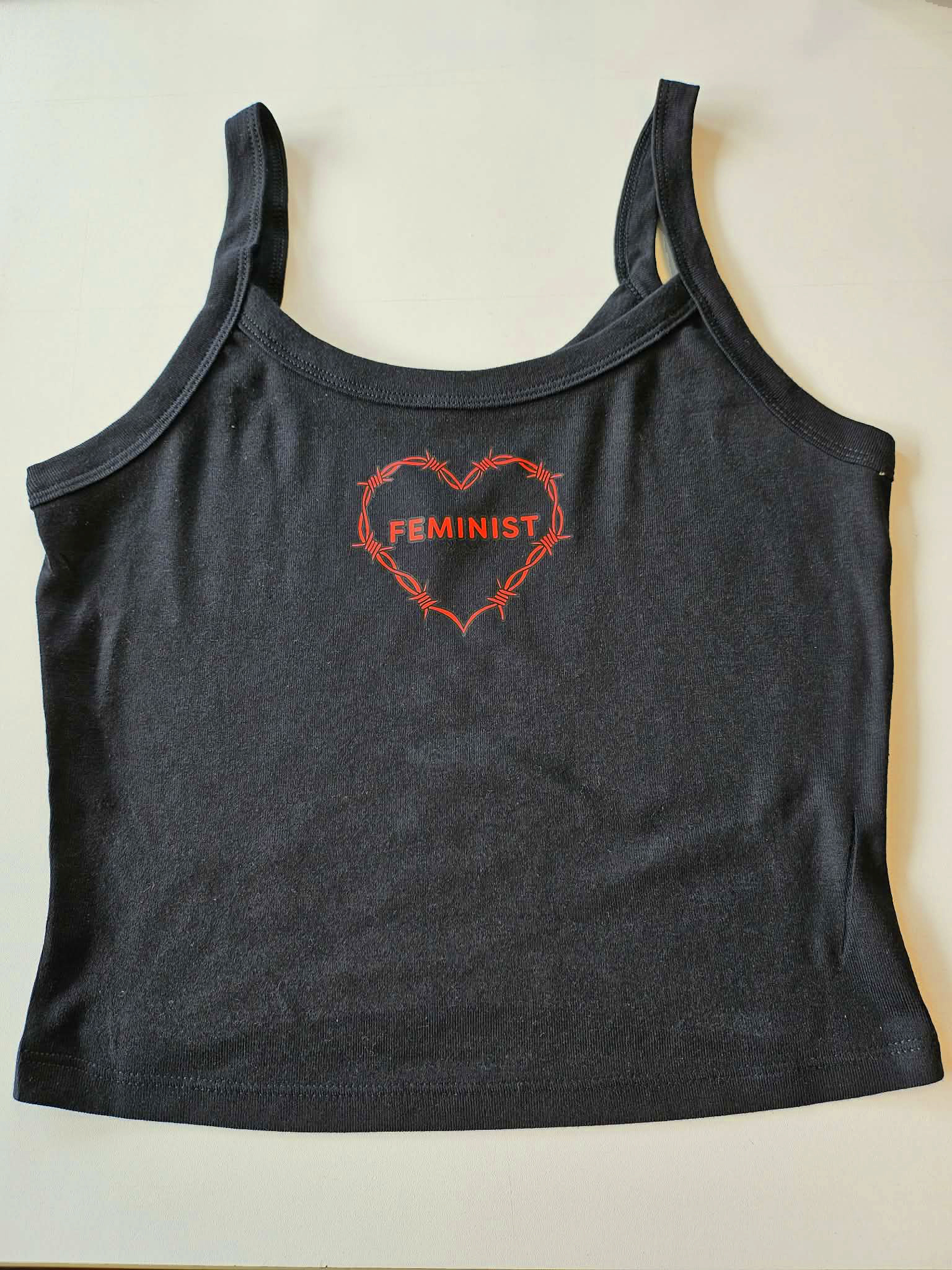 Roter "Feminist" Schriftzug in Herzform auf einem schwarzen Trägertop